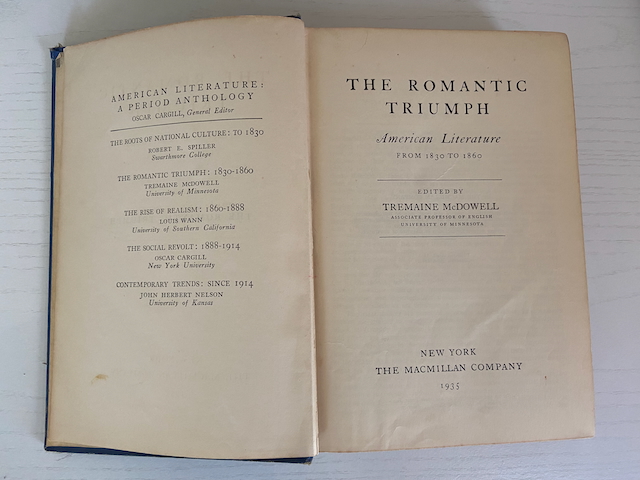This review brings me to my American literature anthology published in 1935, The Romantic Triumph: American Literature from 1830 to 1860. These classes that I’ve briefly summarized gave me an appreciation for how deeply I can read and analyze this book before I even start reading any of its contents.