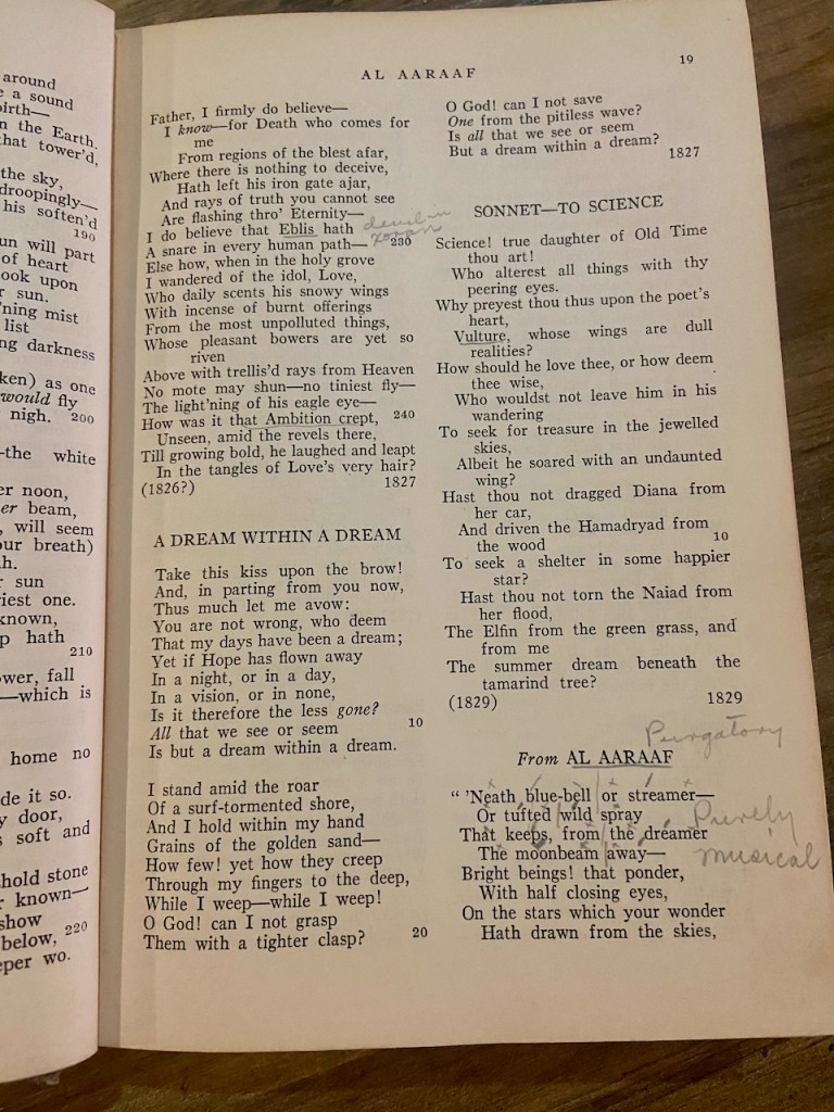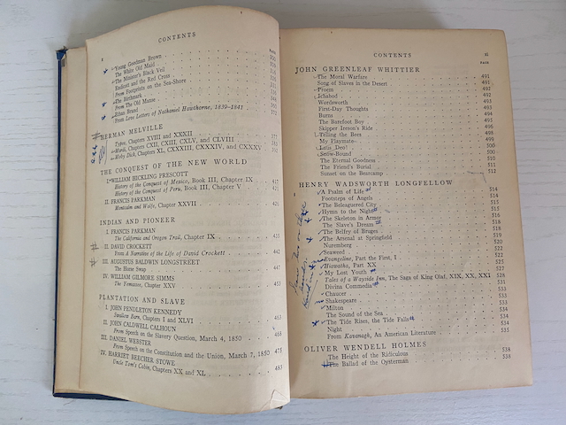 My next question is: what insights can I gain from the students’ annotations and markings on the pages of this anthology? In the table of contents, works by Poe, Emerson, Thoreau, Hawthorne, Melville, and Longfellow are heavily marked. All of these, with the exception of Longfellow, were writers extensively taught in my undergraduate literature classes, so it doesn’t come as much of a surprise. But chances are, these writers were read and taught very differently then than now. Each generation of thinkers, of course, decides what to emphasize, what to minimize, and what to ignore.