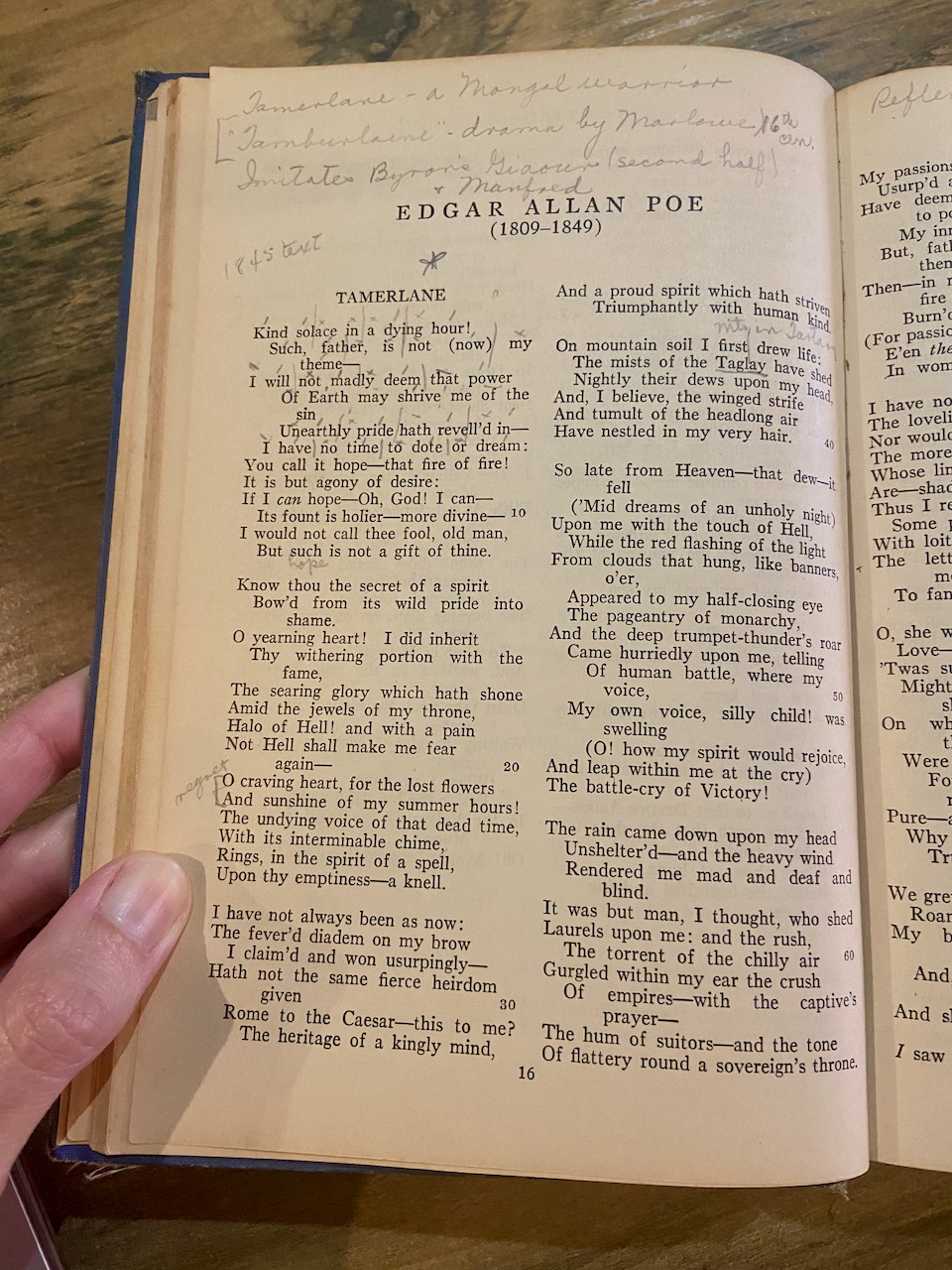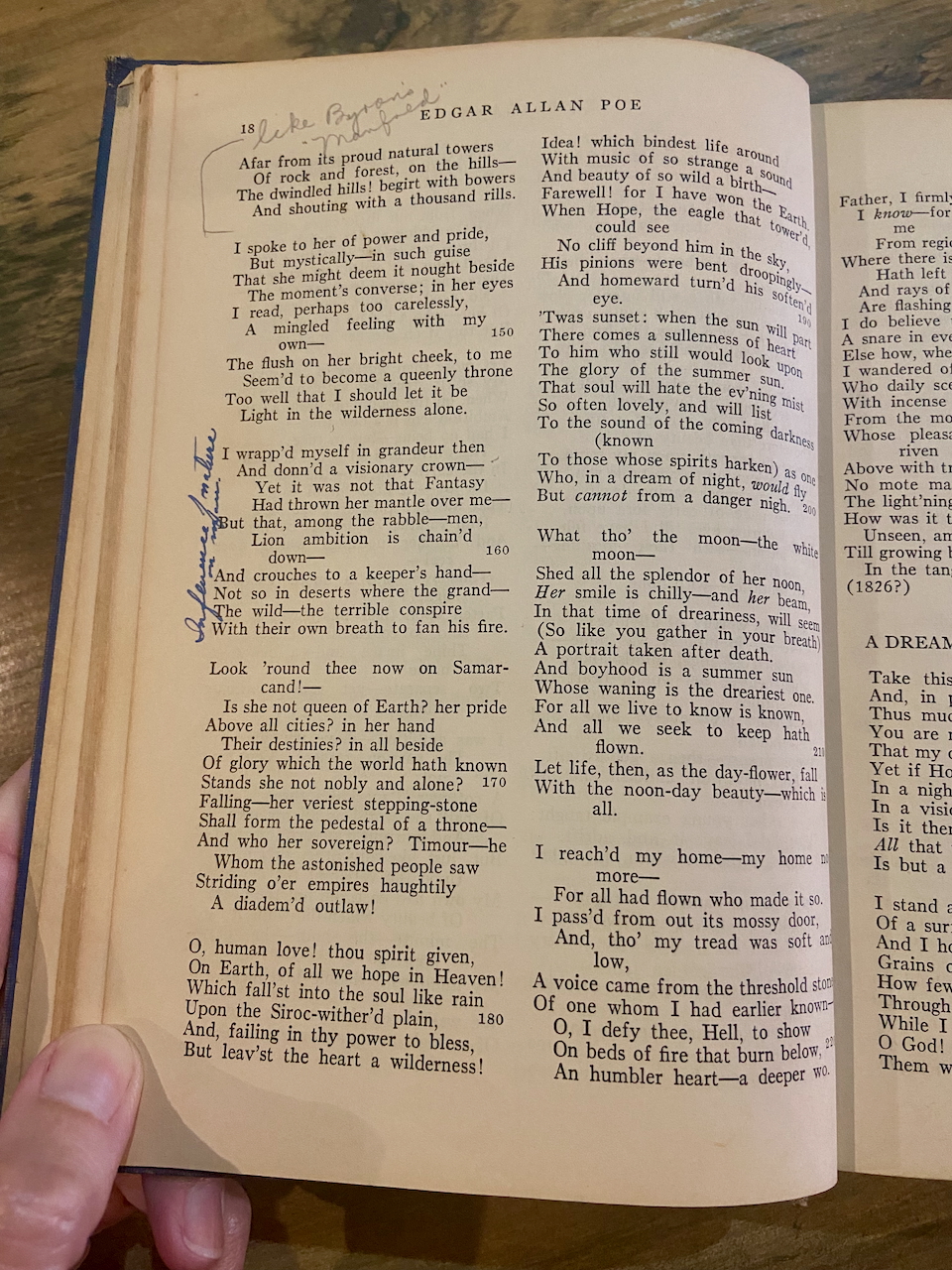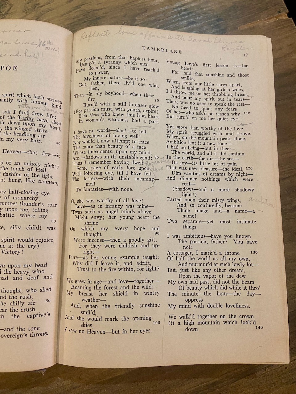 To return to the margins of “Tamerlane,” I noticed that all of the extra-textual references recorded about Marlowe and Byron, as well as the poet’s relationship with Sarah Elmira Royster, were detailed in the biographical footnotes at the back of the book. This suggests that the book’s footnotes were taught directly as course material or that the book’s owner was studying it on her own. Since the footnotes cluster around the time-honored “masters” of American literature, though, I lean toward believing the former idea.